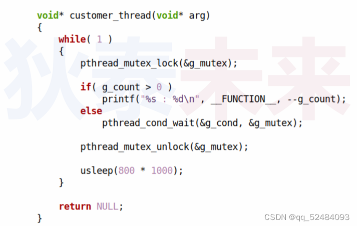 第 24 行,如果消费者发现没有产品,则调用 pthread_cond_wait(&g_cond, &g_mutex) 阻塞在 g_cond 这个条件变量上,并释放已获取到的互斥锁 g_mutex