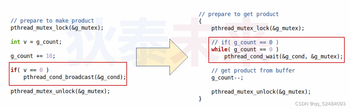 首先,10 个生产者会阻塞在 g_cond 这个条件变量上,生产者生产了 5 个产品后,调用 pthread_cond_broadcast(),唤醒了阻塞在 g_cond 这个条件变量上的 10 个消费者线程,但是消费者线程被唤醒后没有再次进行产品数量判断,而是直接取走了产品,这样就会出现问题