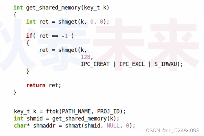 第 53 行,get_shared_memory() 函数调用了 shmget() 函数,shmget() 是一个Linux系统调用函数,用于创建一个新的共享内存段(segment)或获取一个已存在的共享内存段。这个函数会返回一个整数类型的共享内存标识符(ID),用于在后续的系统调用中引用共享内存段