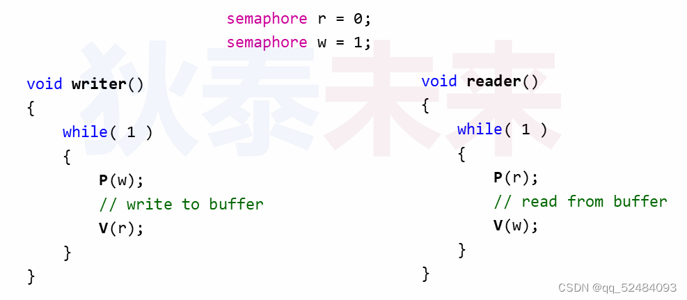 只有主线程写完以后,信号量 r 的值会加一,子线程才能去读;子线程读完以后,信号量 w 的值会加一,主线程才能去写;会一直重复这个流程