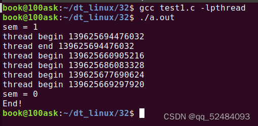 第 28 行,初始化信号量,将信号量的初始值设置为 1,那么这里的信号量等同与互斥锁