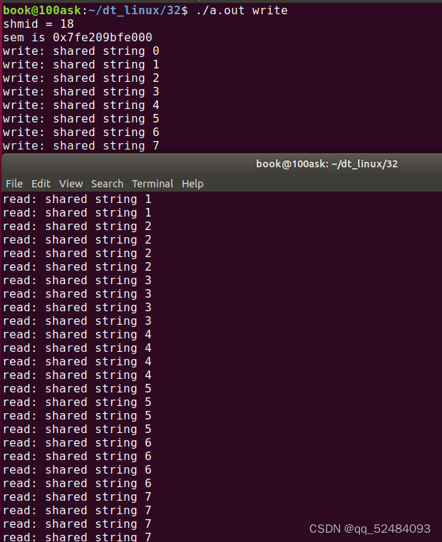 运行了 2 个进程,一个进程写共享内存,一个进程读取共享内存,信号量用于同步多进程间共享内存的读写