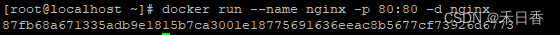 如: docker run --name containerNmae -p 80:80 -d nginx