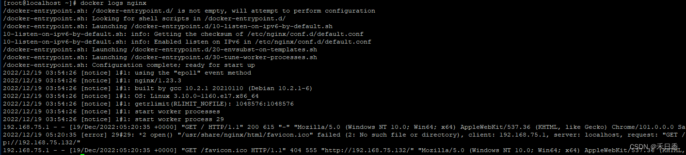 说明:docker logs nginx,其中nginx为容器的名称。