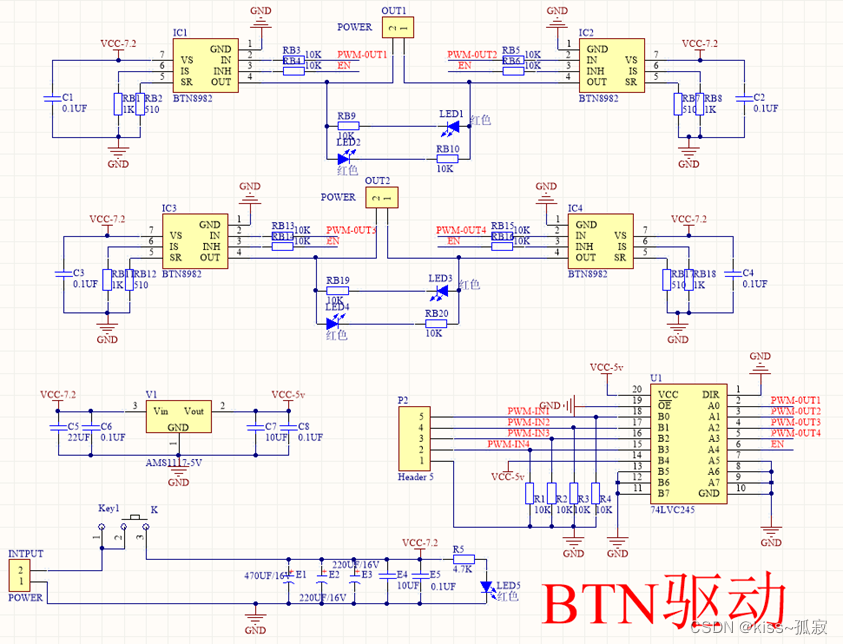 智能车两个后轮采用独立的驱动,用两片BTN8982构成H桥驱动电路,可实现电机的正转和反转。