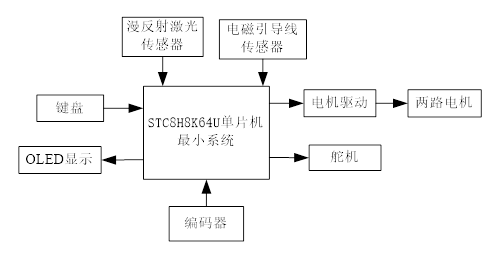 智能车主要由四个部分组成:检测系统、控制系统、动力系统和电源系统。其中检测系统完成两个功能,赛道上电磁引导线的识别及车库前斑马线的识别,电磁引导线采用20KHz配频配幅电感电容模组感应,车库前斑马线采用漫反射激光传感器识别;控制系统以STC8H8K64U单片机为控制系统核心处理器;动力系统主要实现电机转速控制,基于BTN8982设计电机驱动电路;电源系统将电池电源经过稳压模块给系统的各个组成部分供电,如检测系统、电机驱动系统、显示系统等。系统工作流程为,首先通过安装在智能车头部的8个电感电容模组感应赛道上电磁引导线,电容电感模组输出的电压信号经过运放放大后输入STC8H8K64U单片机的ADC转换通道进行AD转换;接着主控单片机根据接收到的电容电感模组输出信号判断前方道路情况,如直线、圆环、上坡、三叉等道路信号,此外还可以判断车身与赛道之间的偏离情况,主控单片机根据8路电容电感模组信号控制舵机转角及两个电机的差速实现车体的转向控制和速度控制。