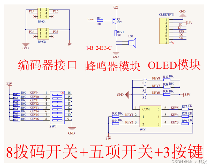 如图9所示为各类模块元件电路,其中有OLED显示,蜂鸣器模块,编码器接口,拨码开关以及五项开关等。