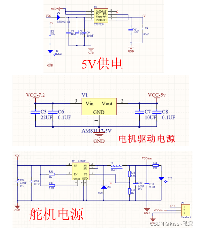 整个智能车采用7.4V锂电池供电,7.4V的电源通过TPS7350稳压输出5V电源,为主板的单片机最小系统、显示、按键等模块供电。舵机最高供电电压为6.0V,7.4V的电源通过舵机电源稳压芯片AS1015调节输出5.9V电源,舵机电源越高则舵机打角反应快,智能车表现更灵敏。电机驱动板的采用另一套独立电源,一是保障该模块的供电电路,另一个原因是减少电机驱动对主板的干扰。三路电源数输出的电流能够满足各路的电流需求。