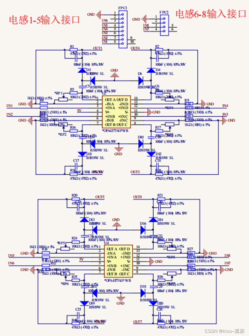 电感电容模组输出的是弱电压信号,需要通过运放电路将其电压信号放大。在本车中通过OPA4377运放组成同相比例运算放大电路对接收到的信号进行放大。调节放大倍数,使经过运放放大后的输出电压为1V左右,单片机通过读取8路电感电容模组输出的信号判断前方道路类型及智能车姿态,通过调整舵机打角及电机转速,使得车辆能跟着赛道中的电磁线行驶。运放电路如图3-4所示。