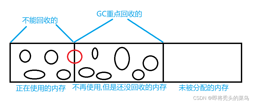 那个红色的圆圈代表, 这个对象, 一半的内存正在使用, 一半的内存不再使用了. 这种情况不会回收, 会等待这个对象彻底不用了, 才会进行回收!!