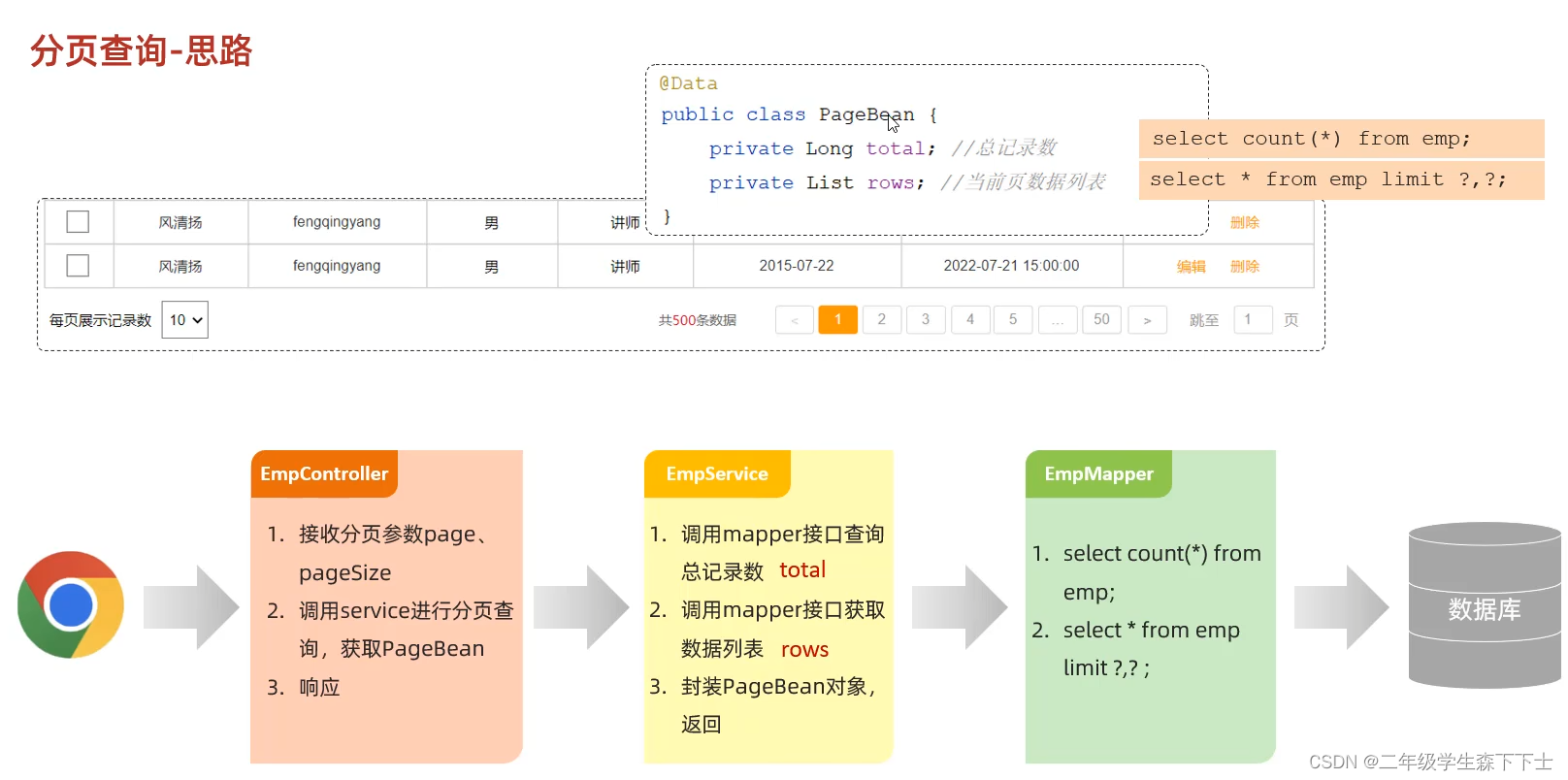 返回参数:PageBean————>由总数量total和返回的数据集合封装而成