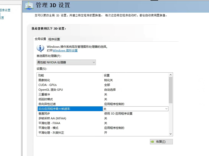 更新完驱动后鼠标在桌面右键,就可以打开NVID控制面板,选择管理3D设置,全局设置里选择高性能NVID处理器优先。
