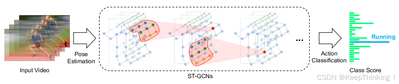 ST-GCN的核心思想是将骨架序列建模为时空图,通过这种图结构,ST-GCN能够同时建模空间和时间维度上的依赖关系。