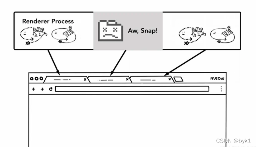 如上图所示,Chrome浏览器采用多个渲染器进程,为每一个选项卡网页运行一个渲染器进程,这样每个选项卡就都有了他自己的渲染器进程,各个选项卡网页之间是独立的,如果其中一个选项卡崩了,就不会影响到其他选项卡的正常工作,依旧能够照常活动。如果他们都在一个进程上的话,一个崩了就会影响到所有的网页的使用,所有选项卡都无法正常工作。