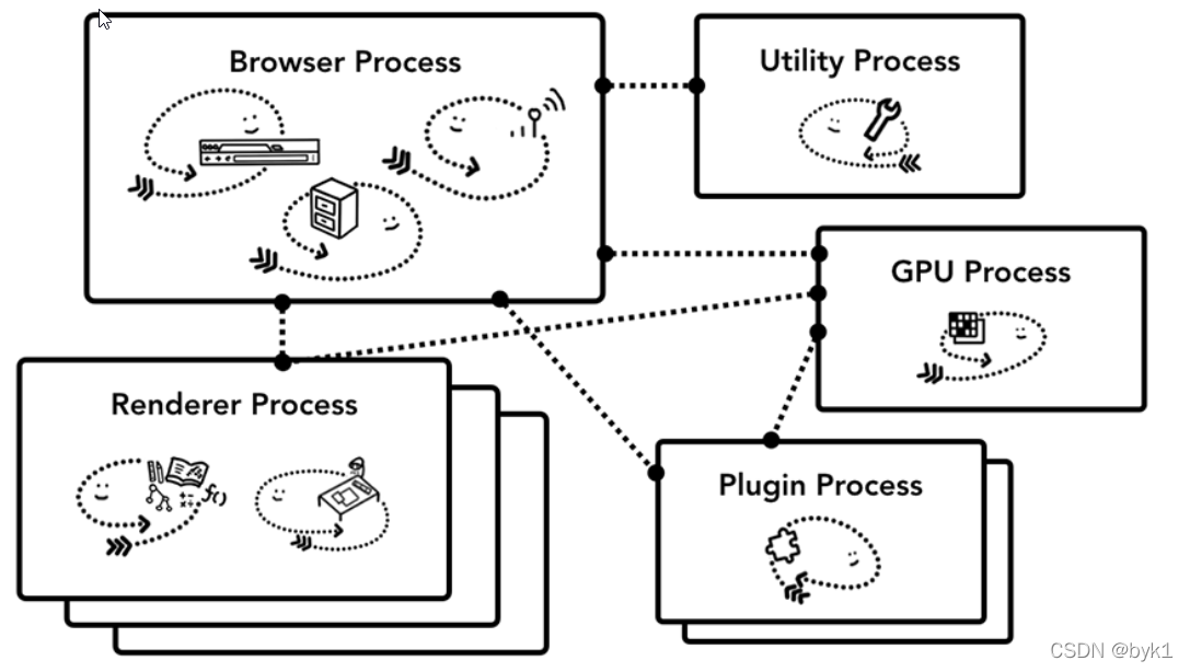 而Chrome采用的就是多进程的架构。这是谷歌开发者社区的一张图,如图我们可以看到有很多不同的进程,Chrome为GPU、Utility、Renderer等都分配了一个进程。在最顶部的是浏览器进程,他和这些负责浏览器应用不同功能部分的进程们相协调,构成整个浏览器应用。
