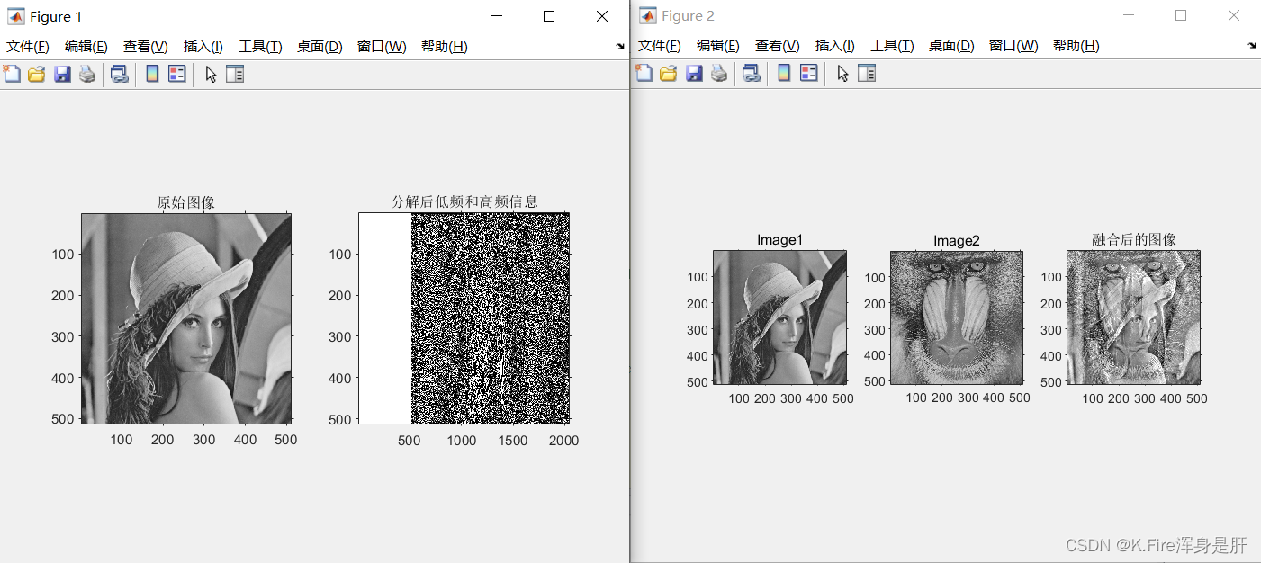 在这个程序中,第一部分进行了小波变换,将低频和高频带显示;第二个示例使用小波变换进行了两幅图像的融合。