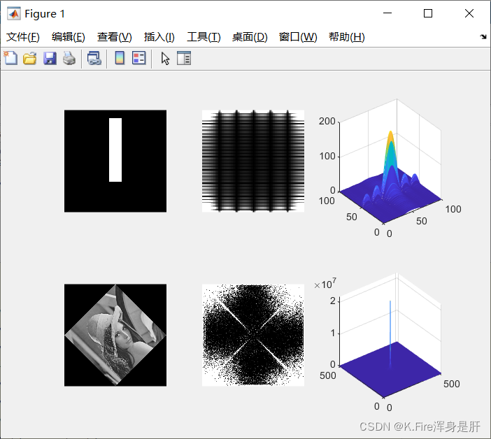 这里我们的第一个图像是自己画的一个黑白方块图,第二个图像是提取的Lune女士的图像并旋转了45度,然后进行傅里叶变换,并进行了移位操作,然后使用二维和三维图分别显示。
