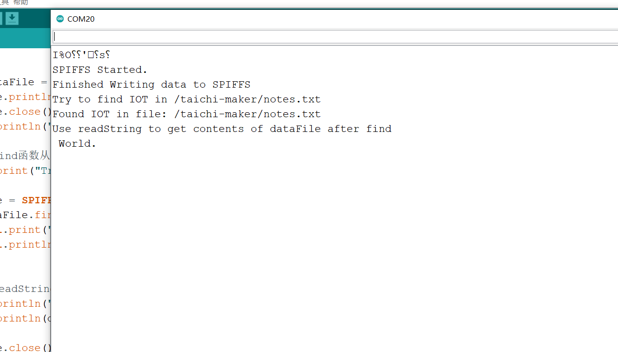 - 以下示例程序是从“3-3-1 ESP8266闪存文件系统基本操作”中的第1个示例程序修改而来。该示例程序通过dataFile.println来向文件中写入信息。使用dataFile.find从闪存文件内容里查找指定信息。使用dataFile.readString来获取信息。这些操作都是针对Stream数据的操作。