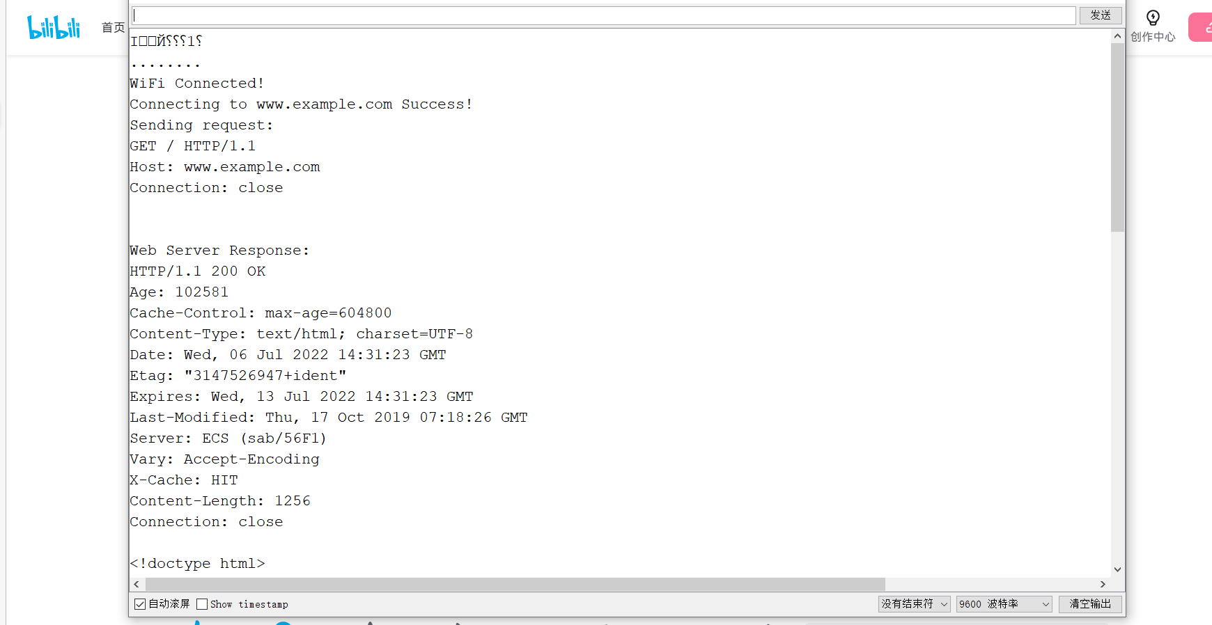 - 该示例程序中,ESP8266开发板通过client.print向服务器发送HTTP请求。这里开发板所发出的HTTP请求信息就是Stream数据。另外,以下示例程序中,ESP8266开发板通过client.readStringUntil来读取服务器响应信息。这里服务器响应信息也是Stream数据