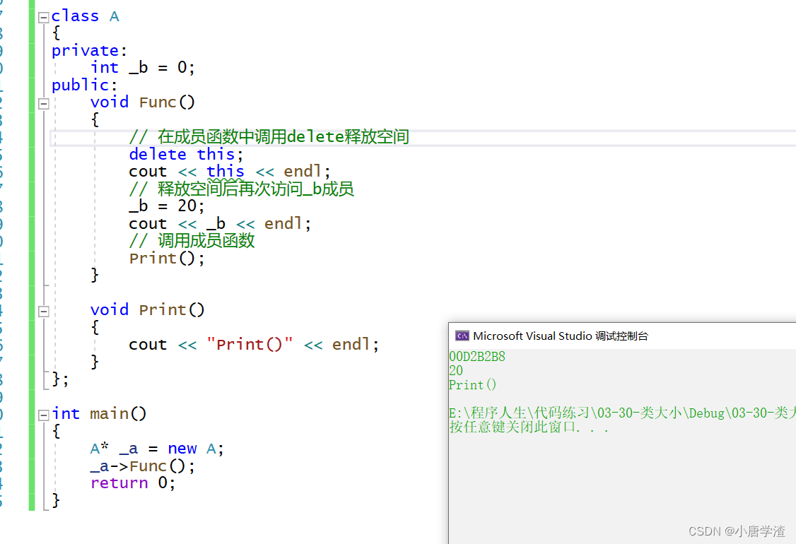 【在成员函数中使用delete会有什么影响】 delete之后访问成员函数就是去访问已经被释放的空间的变量,此时应该会出现非法访问内存的问题,但是实际上并没有其实delete调用的是析构函数清理资源和operator delete 释放空间,operator delete是对free的封装,new的底层是调用的operator new开辟空间,构造函数初始化,operator new是对malloc的初始化,为了避免频繁的malloc和free,会造成内存碎片,所以free的时候不会释放空间,下一次在malloc的时候就会将这个空间进行分配。