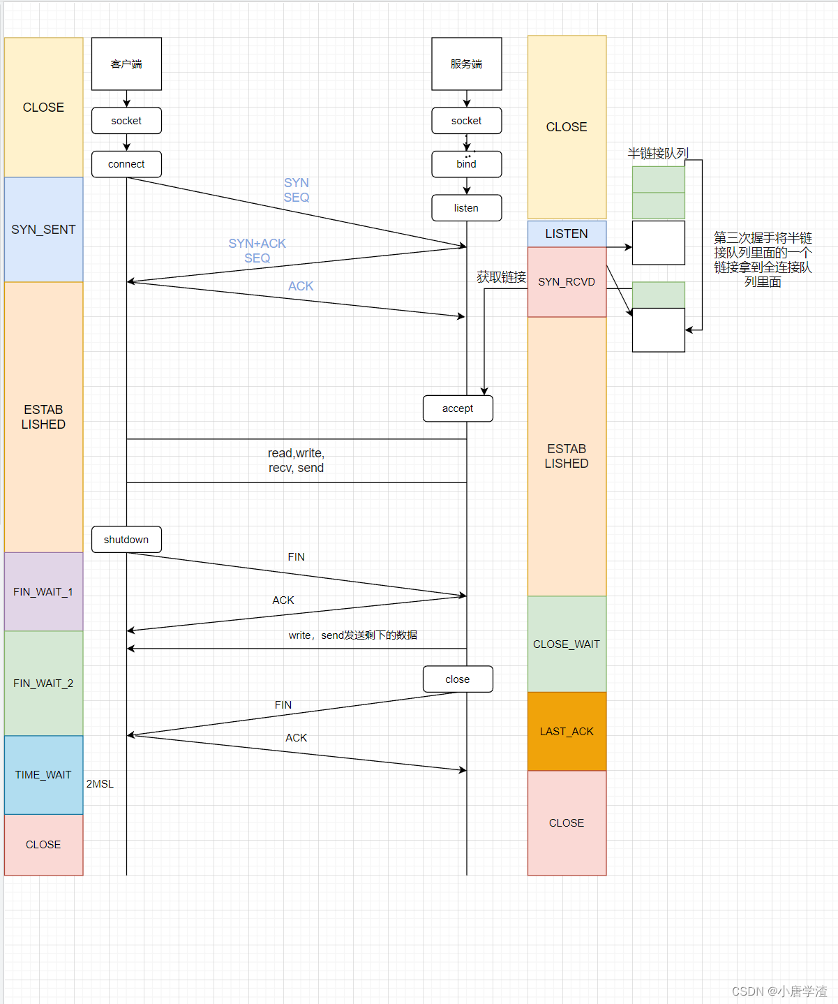 【模拟三次握手第一次握手丢失会发生什么】 用telnet链接一个不存在的服务,第一次握手肯定会丢失,用tcpdump抓包看会发生什么。修改重传次数为3次,然后进行和上面相同的操作。第一次握手冲传次数收到内核参数影响。tcp建立连接到关闭链接图。