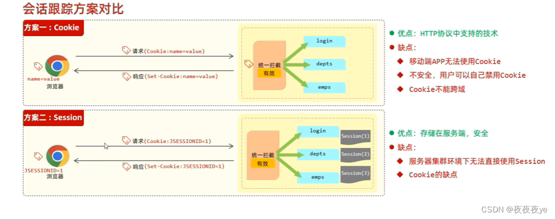 JavaWeb 会话技术:用户打开浏览器,访问web的服务器资源,会话建立,直到有一方断开连接,会话结束,在一次会话中可以包含多次请求或者响应。会话跟踪:一种维护浏览器状态的方法,服务器需要识别多次请求是否来自于同一个浏览器,以便在同-次会话的多次请求中共享数据会话跟踪方案:客户端会话跟踪技术cookie,服务端会话跟踪技术:session. 令牌技术cookie:cookie不能跨域,移动端无法使用,用户可以自己禁用cookiesession:跨域区分三个维度:端口,ip/域名,协议。