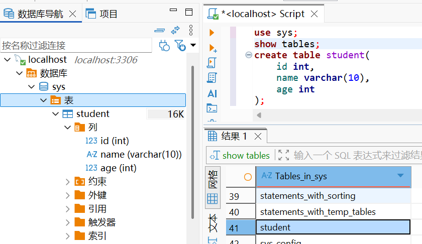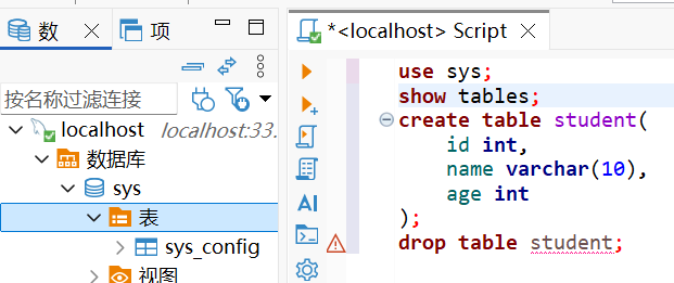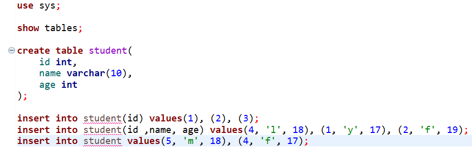cursor.execute('create table student(id int,name varchar(10),age int,gender varchar(2));');