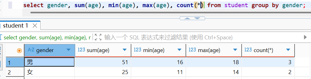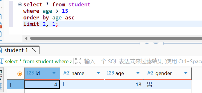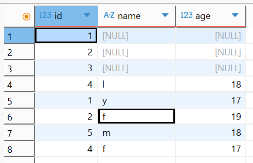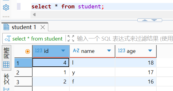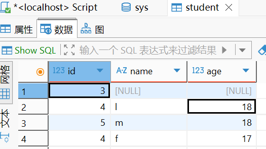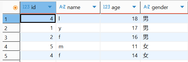 cursor.execute("insert into student values(4, 'l', 18 , '男'), (1, 'y', 17 , '男'), (2, 'f', 16 , '男'), (5, 'm', 11 , '女'), (4, 'f', 14 , '女');")