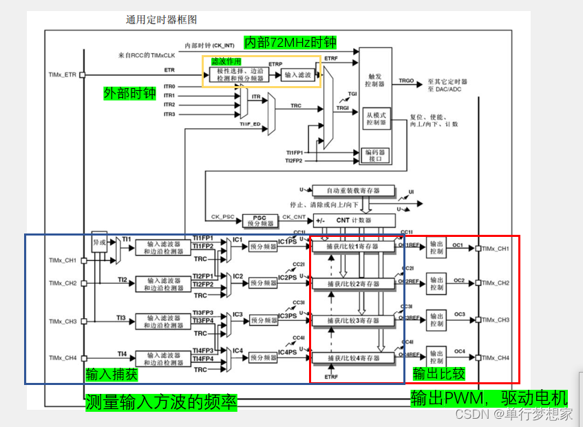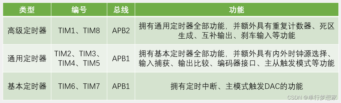 ③不仅具备基本的定时中断功能,而且还包含内外时钟源选择、输入捕获、输出比较、编码器接口、主从触发模式等多种功能