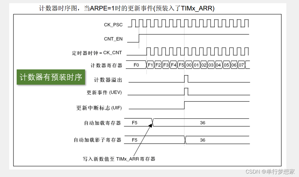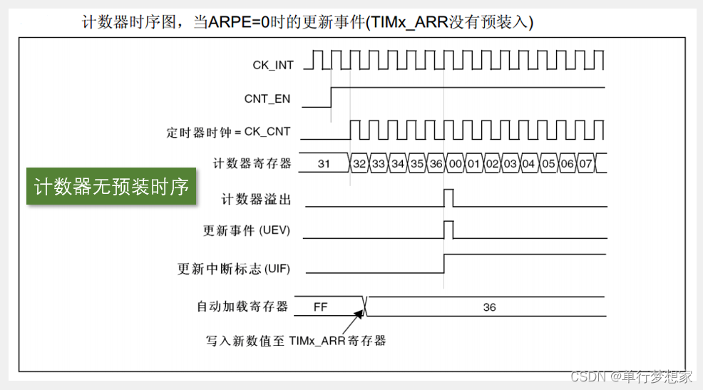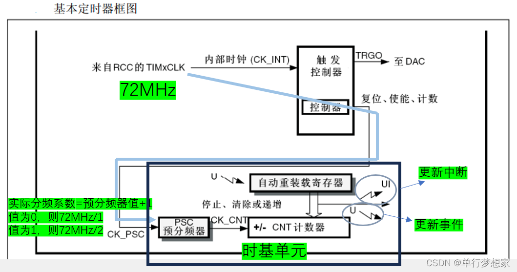 ②16位计数器、预分频器、自动重装寄存器的时基单元,在72MHz计数时钟下可以实现最大59.65s的定时计数器:执行计数定时的一个寄存器,每来一个时钟,计数器加1