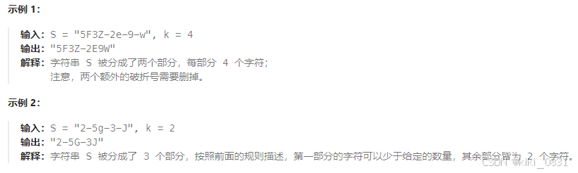 我们想要重新格式化字符串 s,使每一组包含 k 个字符,除了第一组,它可以比 k 短,但仍然必须包含至少一个字符。此外,两组之间必须插入破折号,并且应该将所有小写字母转换为大写字母。
