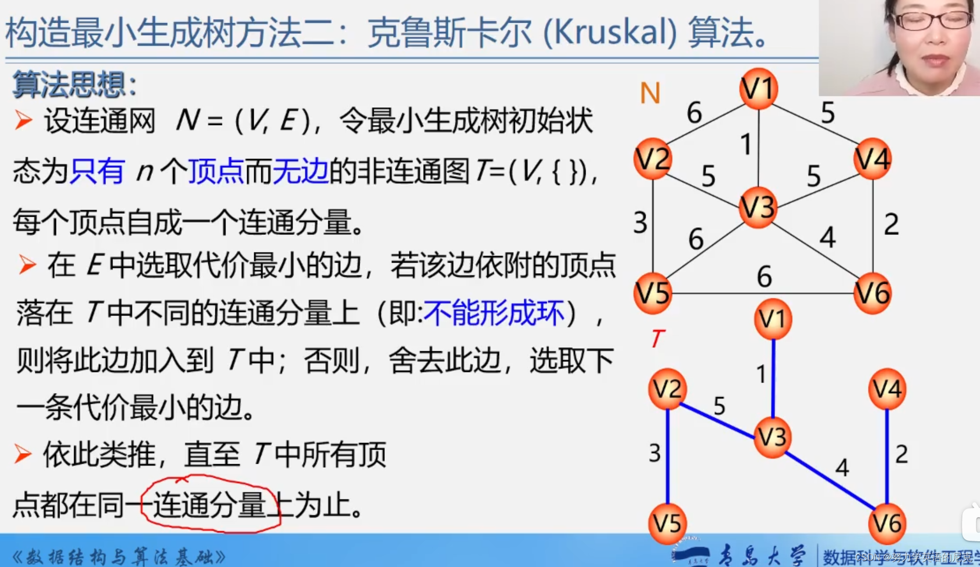 克鲁斯卡尔算法需要所有的顶点先列出来,然后再所有的顶点之间找权值最小的边,如果形成了闭合回路(环),则舍弃这条边,再取权值(代价)最小的边。