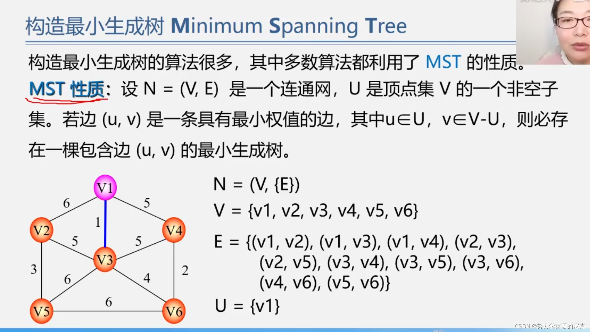U是放在生成树的顶点,先在U中放入第一个顶点,V-U是指剩余的未加入最小生成树的顶点,然后再找U中所有顶点相关联的所有边中权值最小的顶点,且不能再U内存在过的,