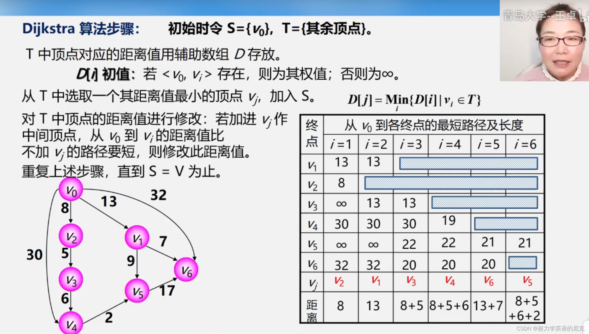有一些点像prim算法,但不全像,都是用S先存入起始顶点,T保存剩余的其他顶点,例如此时S中有起始顶点v0,找从v0到其他所有能直达顶点的距离,如果不能直达记为无穷大,选一个权值最小的顶点,加入到S中,例如上图找到的最小直达顶点为v2,此时再找加入v2后v2直达的顶点路径与v0直达的路径权值比较大小,记录权值较小的,v2从T中也就是剩余的定点中与上一次比较直达的顶点权值,再次记录最小的,直到加入S的数目等于所有的顶点为止。