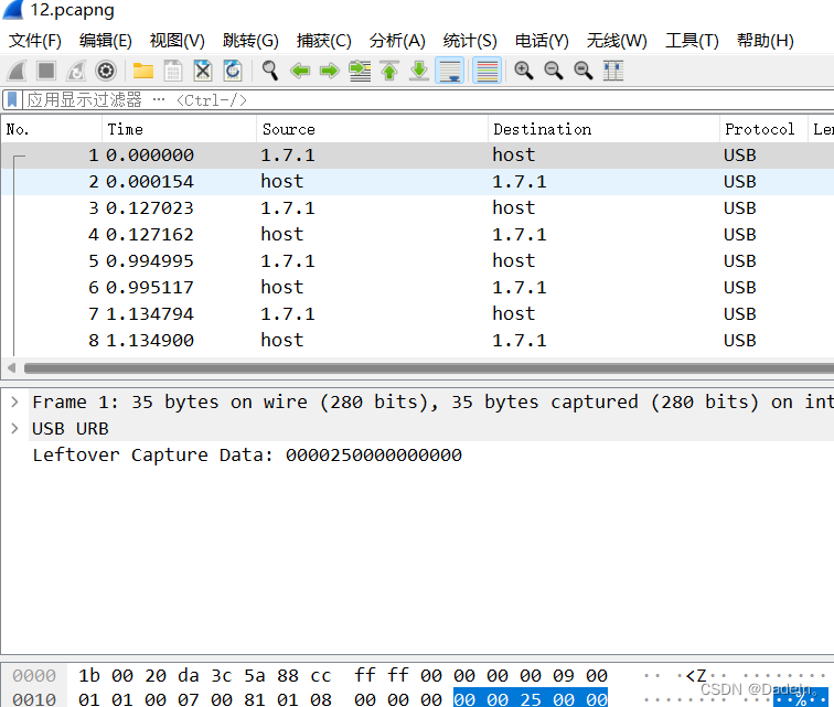 随便打开一个数据包查看 发现是八字节 为键盘流量