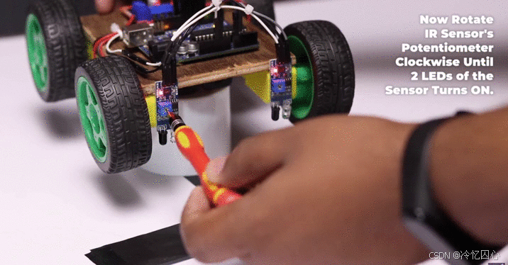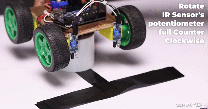 按照我在图片中展示的方式放置汽车。现在,您已准备好进行校准。首先将2个电位计(左侧和右侧传感器均为)逆时针旋转。