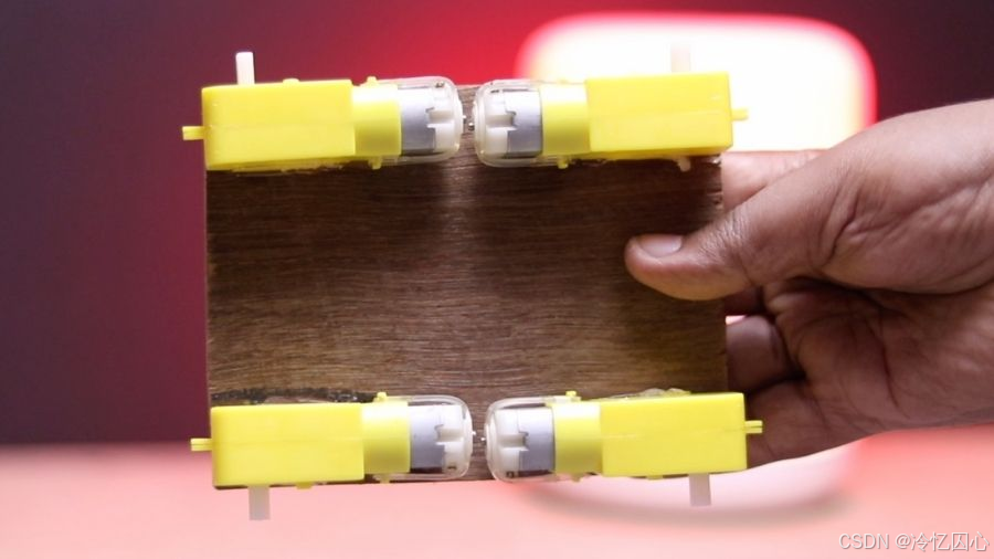 现在用胶枪或任何其他胶水将电机连接到胶合板的 4 个角上。确保在连接电机时,电机对准应该是正确的。否则,汽车将无法直行。
