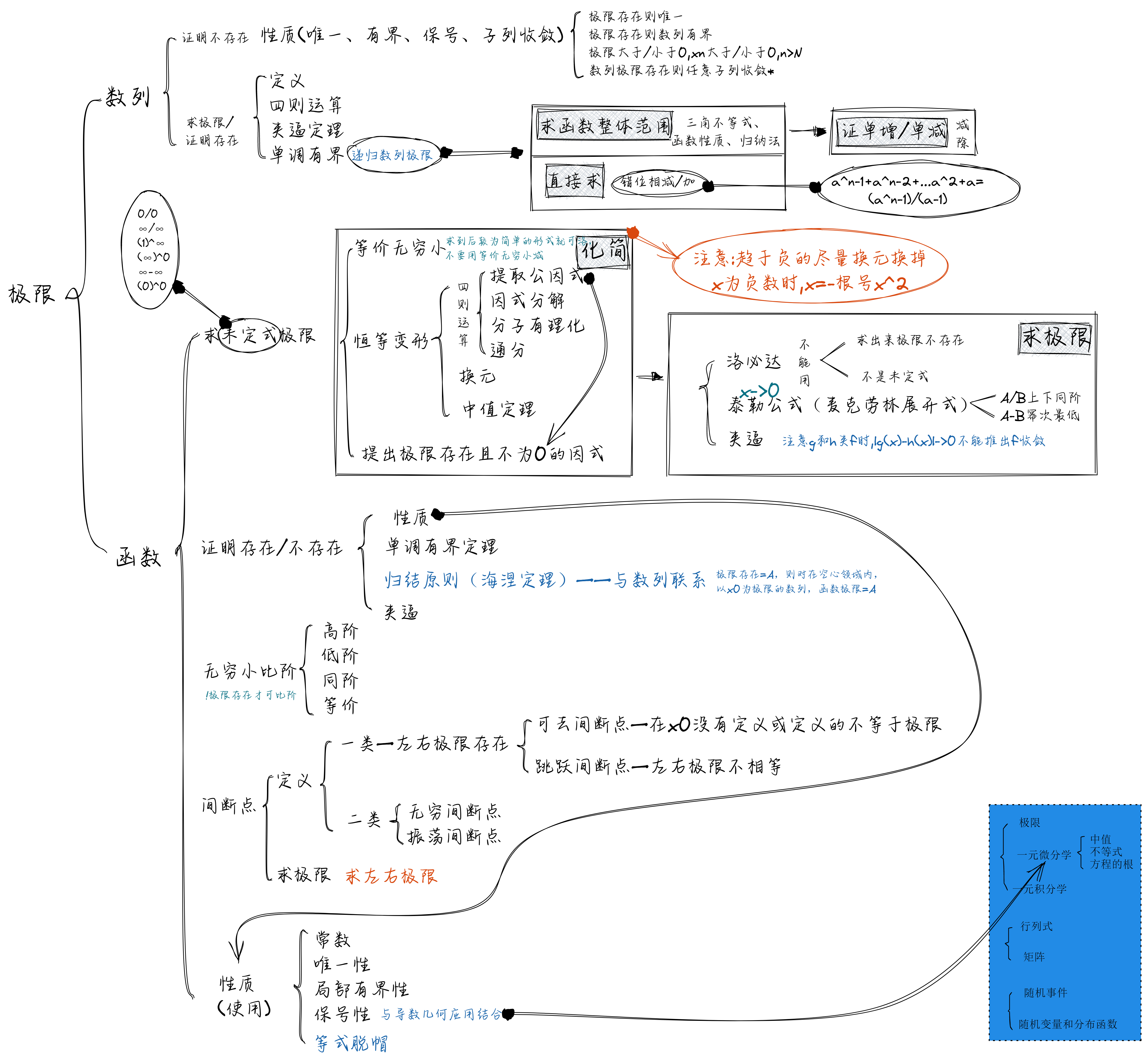 考研数学——极限学习总结 数列极限,题一般是证明极限存在或者求极限。有五种解题思路,定义、性质、四则运算、夹逼、单调有界,最后一个一般用于递推数列。求递推数列极限一般解法是,先用各种方法,比如数学归纳法、三角不等式,求数列大致范围,再减/除,并根据范围求得求单增/单减的性质,得出极限存在,最后等式两边极限即可得极限。也有的递推数列可以直接求出数列的解析式。 直接求递推数列时,要灵活运用错位相减/加。函数极限,有几种考察方向,未定式极限、间断点、证明存在/不存在、无穷小比阶、性质使用。主要是未定式极限和间断点的考察,性质