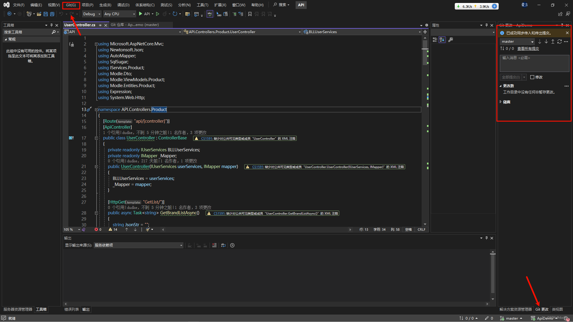 如果需要回滚,到你指定的记录,则需要选中那一条,右键》选择还原即可:例如我要还原刚才提交的记录,则选中“+测试回滚功能测试”》右键》还原即可。然后回到代码中查看,刚才加的那条代码已经不见了,回滚到了之前,这就是vs中可视化的回滚功能,非常简单易懂。在visual stodio中装好git之后,打开一个有git仓库的程序。git的代码操作一直很麻烦,IDE提供了一个很不错的插件。点击查看所有提交按钮:可以看到历史的提交记录。接下来会在传出中添加一条数据:点击推送即可。