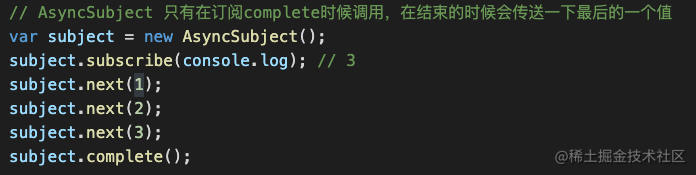 AsyncSubject:complete时会输出最新的管道数据,其余时间不输出