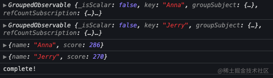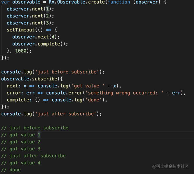 上图中,我们也可以看到一个完整的 subscribe 订阅内部的构成。next函数接受管道传值;error接受传值异常后的错误信息;当响应式对象调用complete函数后,执行complete函数,并结束该次订阅。