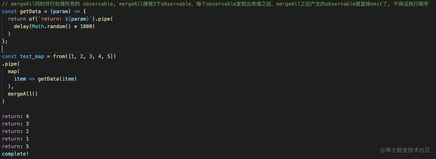 mergeAll 不会像 concatAll 一样首尾相连输出值,其并行处理所有的 Observable,不保证输出顺序。