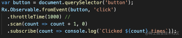 Observable.fromEvent(document.getElementById("debounceTime"), "click").debounceTime(1000).subscribe(() => console.log("debounceTime"));Observable.fromEvent(document.getElementById("throttleTime"), "click").throttleTime(1000).subscribe(() => console.log("throttleTime"));