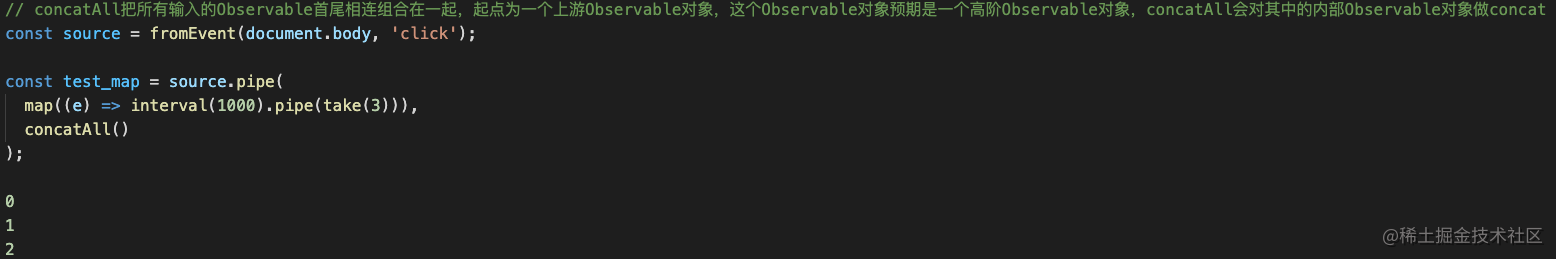 concatAll 一般用于处理一次性或者短时间内有多个管道数据的情况。比如处理点击事件,在他前置的运算符,必有一个类似于map的映射,concatAll 可以将一个 Observable 对象映射为拍平的值来依次处理。