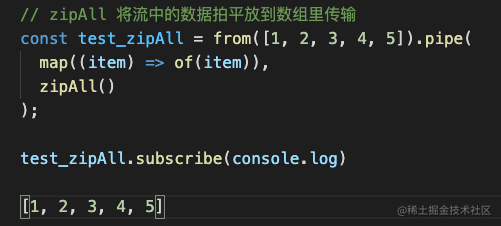 下图中,zipAll 将 from 操作符解构出的流式数据又拼接回数组形式。