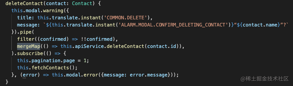 上面的实战例子,接受一个弹窗关闭事件,判断值是否为confirmed,若是,则交给 mergeMap处理。