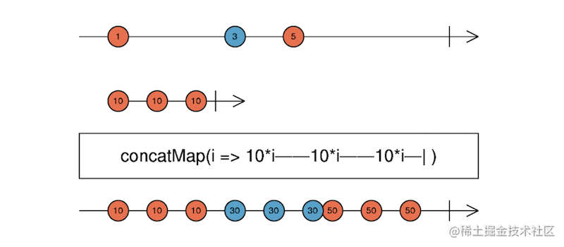 类似的,concatMap 是按照顺序排列的,使用场景更加广泛。每个新的内部 Observable 与先前的内部 Observable 首尾串联组成。他解决了 concat 和 concatAll 的一个问题:后一个数据流拿不到前一个数据流抛出的数据。