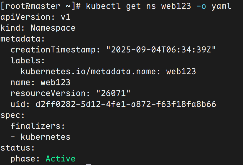 kubectl get ns web123 -o yaml
