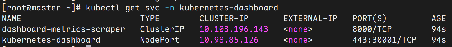 kubectl get svc -n kubernetes-dashboard